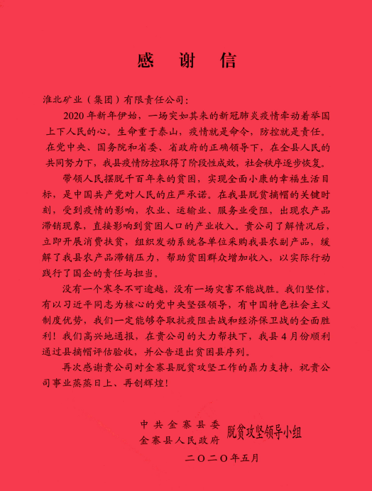 在新冠肺炎疫情防控期间,发动所属各单位积极采购该县滞销农产品,帮助贫困群众增加收入,以实际行动践行国企的责任与担当,帮扶金寨县顺利通过摘帽评估验收,并公告退出贫困县序列,给予的鼎力支持表示感谢。