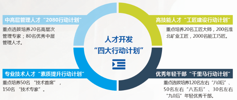 “4”即实施人才开发培养“四大行动计划”:中高层管理人才“2080行动计划”、专业技术人才“素质提升行动计划”、高技能人才“工匠建设行动计划”、优秀年轻干部“千里马行动计划”。