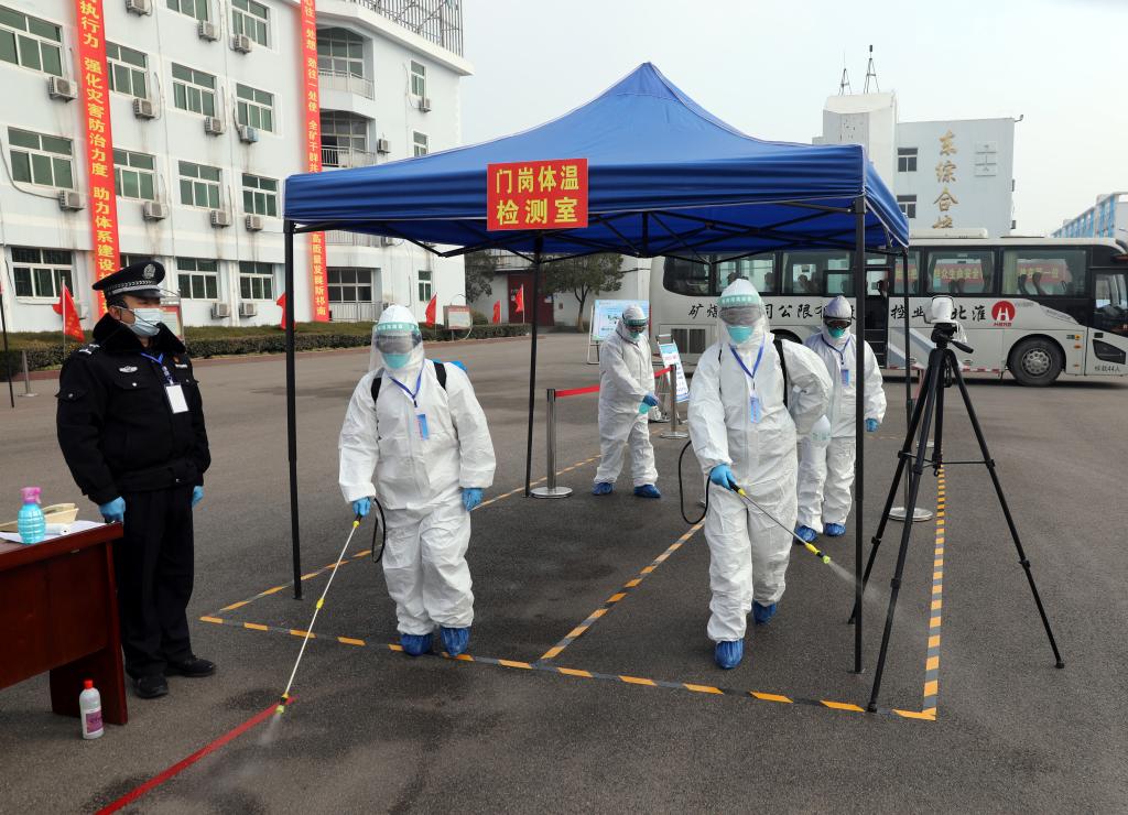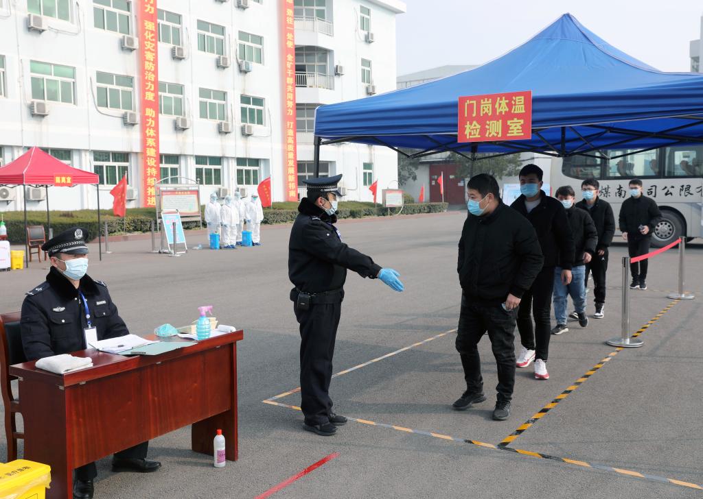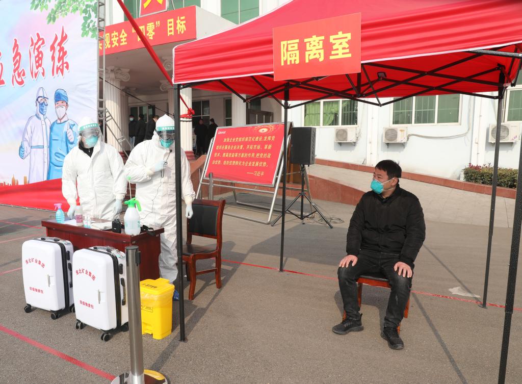 “报告,我是门岗值班孙建,通过观察测温通道发现有一名职工体温在37.7℃,疑似为新冠肺炎患者,现已引导至空旷地方等待,并进行相关信息登记。”“请做好个人防护,原地等待,我现在联系隔离室工作人员到门岗进行紧急处理。”……