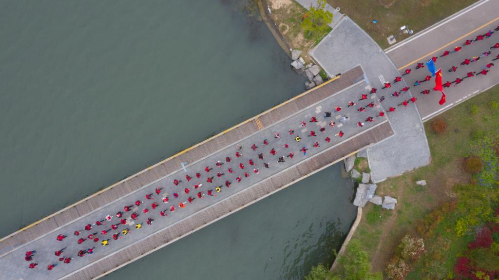 4月24日上午,淮北市南湖国家级湿地公园健身步道上,淮北矿业集团200名身穿红马甲、边走边唱红歌的青年环湖毅行队伍吸引着在此徒步健身的市民驻足观看,不少市民还拿出手机进行拍照。这是集团在此举行的“学党史、强信念、跟党走”主题团日活动中的一组镜头。