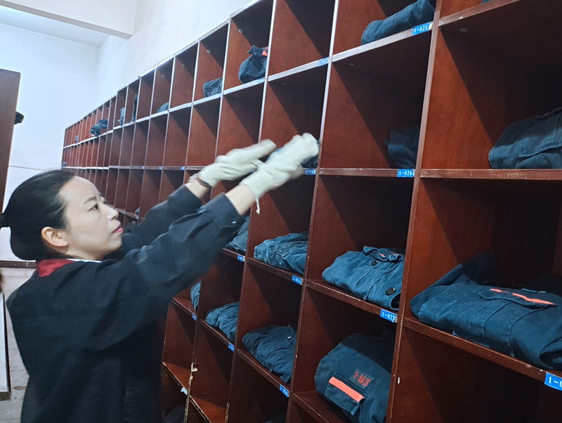 赵白艳,物业管理科洗衣工。当天早上7:00接班后,她就和姐妹迅速进入快速忙碌模式。两个人先是把夜班刚刚收到的脏衣服放入洗衣机,然后把上班人员没来得及整理的干净衣服整理上架。她说,目前矿井自营单位加上外委施工人员,一个圆班大约要有700套工作服需要清洗更换。随着天气越来越热,矿工师傅换衣服的频次会不断加大,工作量无形中会增加不少。但无论工作再忙再累,服务质量一点儿也不能下降。再说了,矿不久前还在我们这里开了地面现场会,洗衣班就是我们科对外的一扇窗口,大家的满意就是我们的标准。