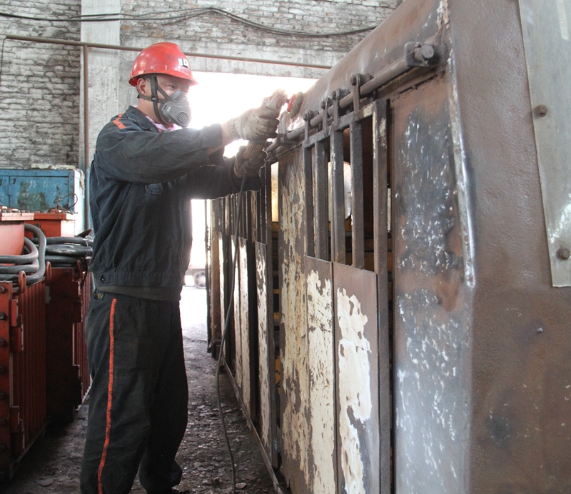 检修工在聚精会神的打磨“亮化”井下平巷乘人车
