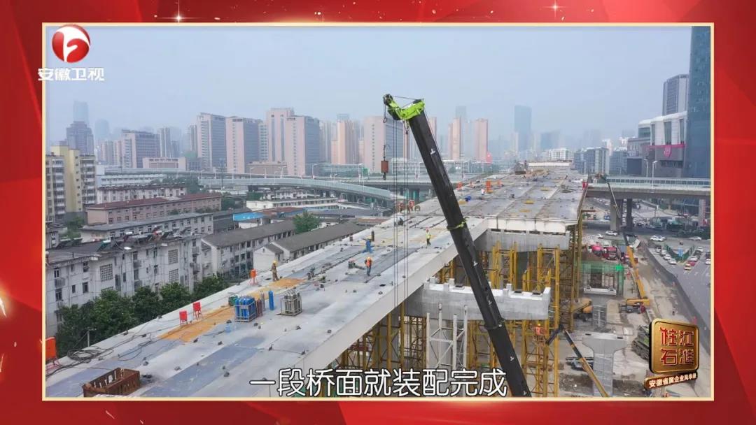 这里是位于安徽合肥的一个重要交通节点——南二环高架的施工现场,我们可以看到,提前在工厂里生产的钢梁正被一块块吊装起来,短短几个小时,一段桥面就装配完成。