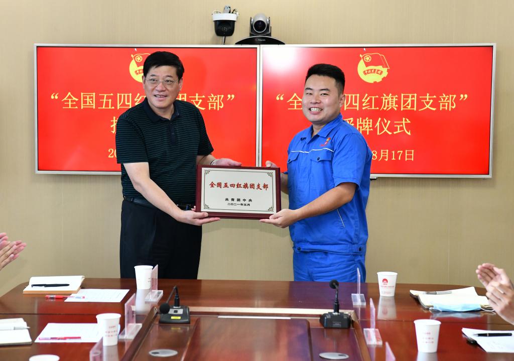 在淮北选煤厂举行“全国五四红旗团支部”授牌仪式,集团公司工会第一副主席刘杰出席仪式并看望慰问2021年新入职高校毕业生。