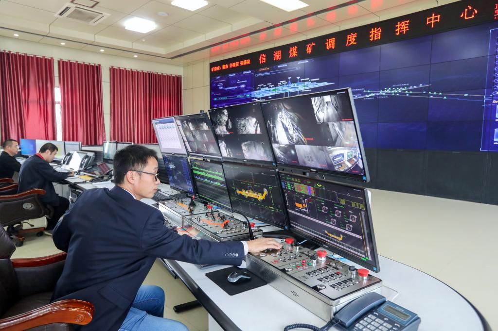 记者在信湖矿调度控制中心看到,两排10多米长操作台摆满显示屏、控制器,40多平方米电子大屏分屏有规律地显示着井下地面各生产现场实时画面,几名操控专员时而专注画面、按下按钮。