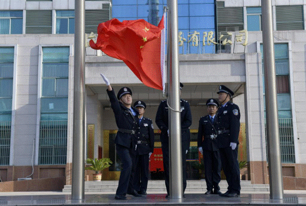 在高亢嘹亮的《æŒå”±ç¥–å›½ã€‹ä¹æ›²å£°ä¸ï¼Œå›½æ——护å«é˜Ÿæˆå‘˜è¿Žç€æœé˜³ï¼Œè¿ˆç€é“¿é”µæœ‰åŠ›çš„æ¥ä¼ï¼ŒæŠ¤å«ç€äº”星红旗走å‘凿——å°ã€‚ä¼´éšç€é›„壮豪迈的国æŒå£°ï¼Œé²œè‰³çš„五星红旗冉冉å‡èµ·ï¼Œè¿Žé£Žé£˜æ‰¬ã€‚å¹¿å¤§å¹²ç¾¤ç¥žæƒ…åº„ä¸¥è‚ƒç©†ï¼Œå±æ¯å‡è§†ï¼Œé¢å‘国旗行注目礼,共åŒç¥æ„¿ä¼Ÿå¤§ç¥–å›½æ›´åŠ ç¹è£æ˜Œç››ã€�