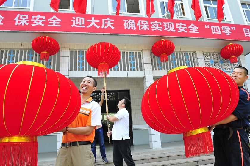 æ–°ä¸å›½æˆç«�70周年之际,朔石矿业在工业广场ã€ä¸»è¦é“è·¯ç‰åœºæ‰€æ‚¬æŒ‚大红ç¯ç¬¼ã€äº”星红旗,è¥é€ 浓厚的节日喜庆氛围。图为该公å¸èŒå·¥æ»¡æ€€å–œæ‚¦å¿ƒæƒ…å¼ ç¯ç»“彩,抒å‘爱国情怀。(乔时庆)