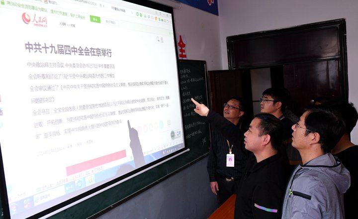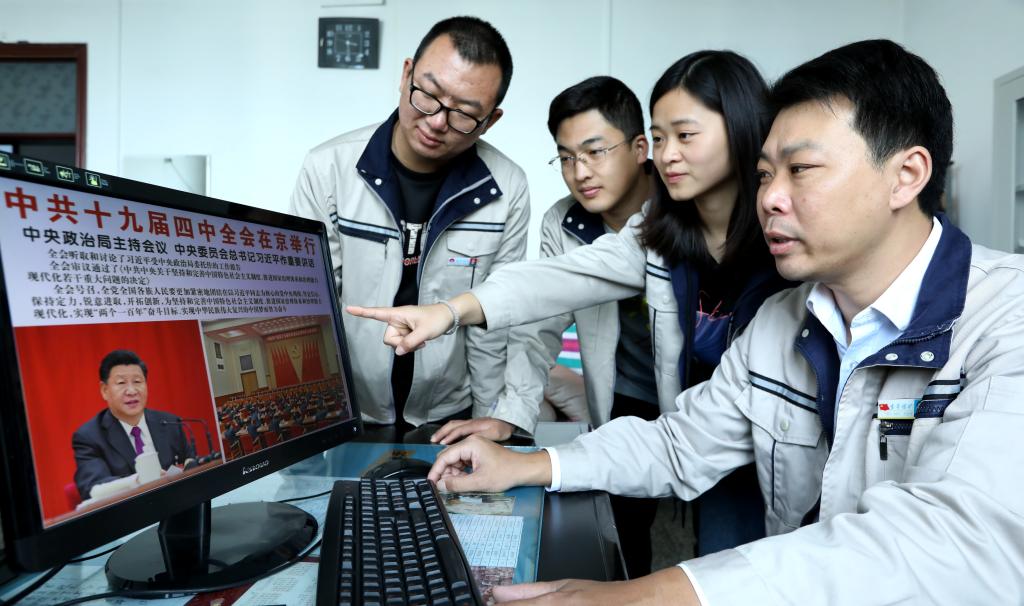 11�1日,在淮北选煤厂政工党支部党员活动室内,党小组成员正在学习刚刚下发的中国共产党第十九届中央委员会第四次全体会议公报。该厂党员干部在全会公报公布后,通过各种途径第一时间学习公报精神,深入了解党的建设科学制度体系、总体目标、重大战略任务等内容,以党的最新理论武装头脑,指导实践,推动工作。(韩晓� 摄)