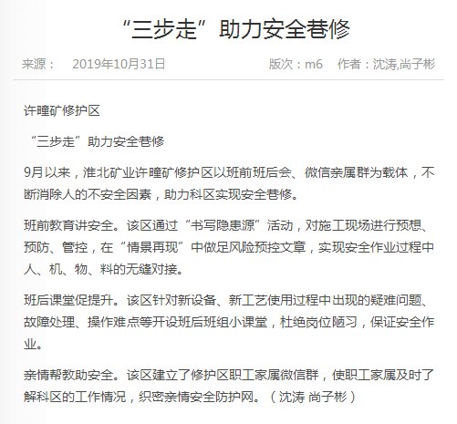 《中国煤炭报》:太子娱乐城 许疃矿修护区“三步走”助力安全巷修