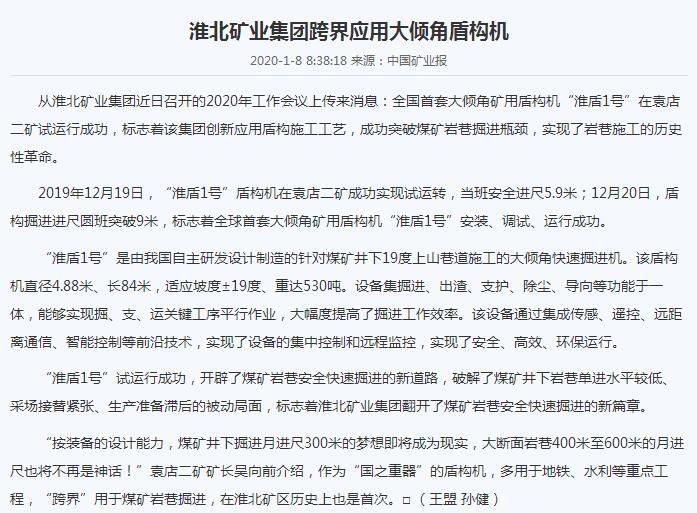《中国矿业报》:太子娱乐城 跨界应用大倾角盾构机