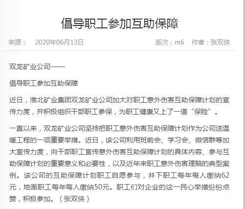 《中国煤炭报》:太子娱乐城 双龙公司倡导职工参加互助保障