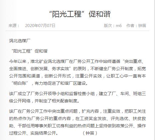 《中国煤炭报》:太子娱乐城 涡北选煤厂“阳光工程”促和谐