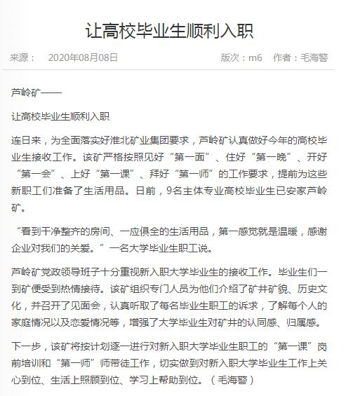 《中国煤炭报》:太子娱乐城 芦岭矿让高校毕业生顺利入职