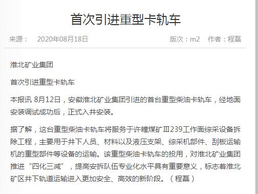 《中国煤炭报》:太子娱乐城 首次引进重型卡轨车