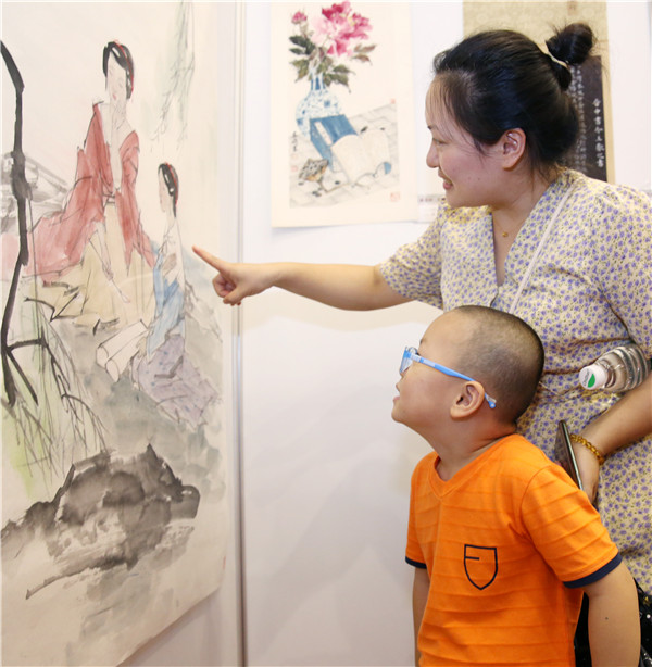 䏀使¯äº²å¸¦é¢†å©åè§‚èµä½œå“。(韩晓å…� 摄)