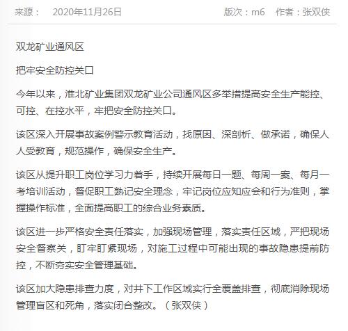 《中国煤炭报》:太子娱乐城 双龙矿业通风区把牢安全防控关口