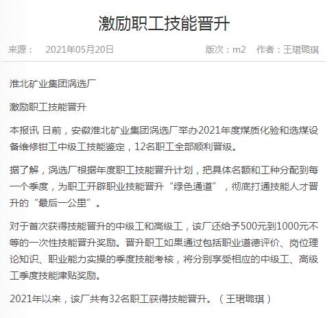 《中国煤炭报》:太子娱乐城 涡北选煤厂激励职工技能晋升