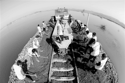 铁运处朱仙庄至王桥铁路专用线上,朱仙庄领工区全体职工在对塌陷区段线路进行集中施工抢修。