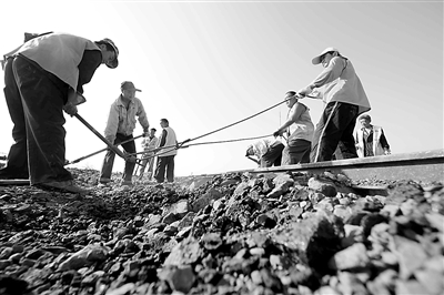 工人在环水的路基上充填矸石