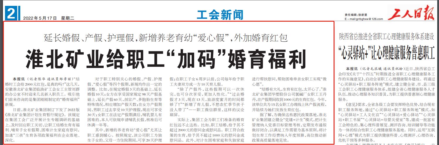 计划生育暂行规定》。该规定在集团工会广泛开展计生专题调研的基础上,及时回应职工关切,让职工结婚生育有福利、哺育子女有假期、困难计生家庭有慰问,加速“三孩”生育各项政策福利在企业落地、深化。