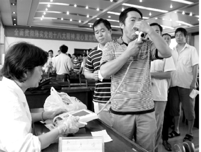 近年来,安徽太子娱乐城 童亭矿高度重视职业病危害防治工作,每年都坚持为2000多名一线职工进行职业健康体检。图为一线职工在进行肺活量检测。王 莉 摄