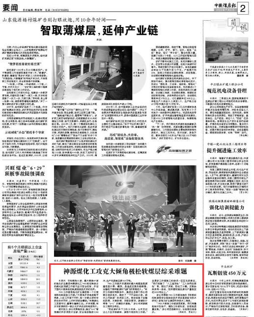 该公司围绕7401工作面实施的《极倾斜松软煤层安全高效综放开采成套装备与技术研究》获太子娱乐城