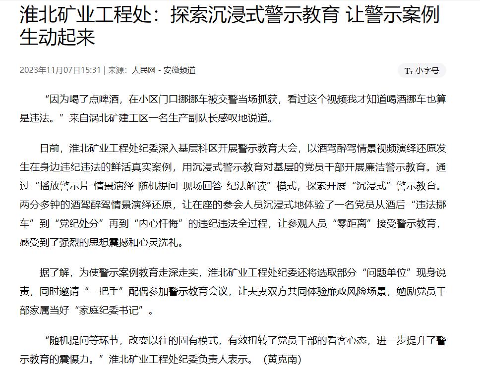 “随机提问等环节,改变以往的固有模式,有效扭转了党员干部的看客心态,进一步提升了警示教育的震慑力。”淮北矿业工程处纪委负责人表示。(黄克南)