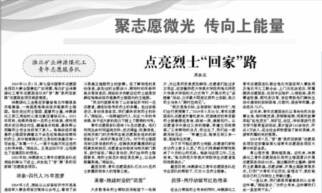 åœ¨å…¨åŠ›å¸®åŠ©çƒˆå£«å¯»äº²çš„åŒæ—¶ï¼Œç¥žæºç…¤åŒ–å·¥é’å¹´å¿—æ„¿æœåŠ¡é˜Ÿè”åˆæ·®åŒ—å¸‚é€€å½¹å†›äººäº‹åŠ¡å±€åŠæ·®åŒ—市义工è”åˆä¼šï¼Œä¸Šé—¨ä¸ºæŠ—战è€å…µã€å†›å±žæä¾›å¿—æ„¿æœåŠ¡ï¼ŒåŒ…æ‹¬ä¸“ä¸šé™ªæŠ¤ã€å¿ƒç†å’¨è¯€€è‹±çƒˆäº‹è¿¹æ”¶é›†ã€æ…°é—®èµ°è®¿ç‰ï¼Œæ—¨åœ¨å¸®åŠ©ä»–ä»¬è§£å†³ç”Ÿæ´»ä¸é‡åˆ°çš„å®žé™…å›°éš¾ï¼Œå·²æ…°é—®ã€æœåŠ¡å†›çƒˆå±žã€å‚战è€å…µ73户ã€�