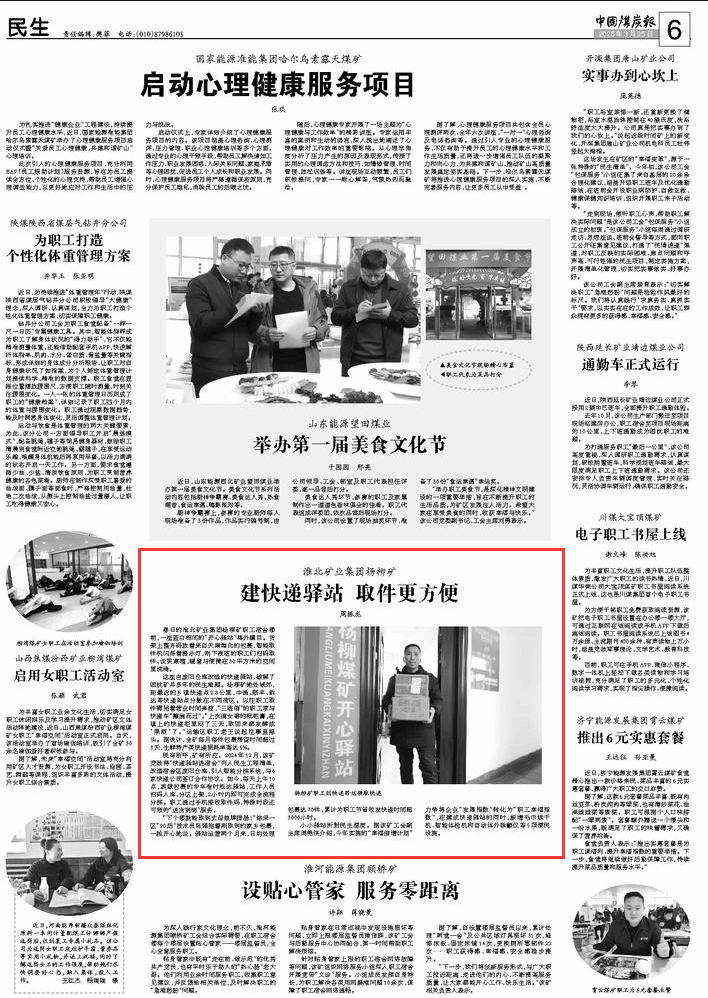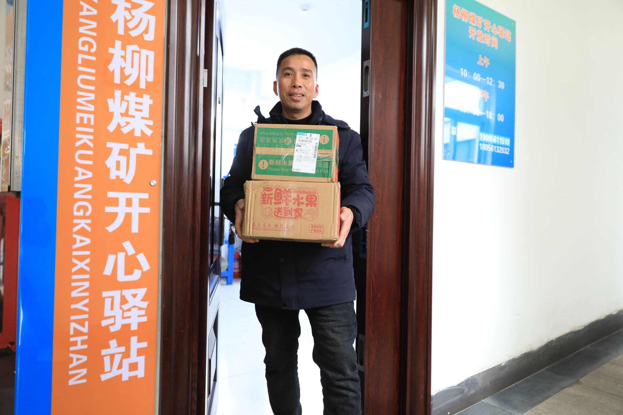 杨柳矿职工宿舍楼前,一座蓝白相间的“开心驿站”格外醒目。货架上整齐码放着来自天南海北的包裹,智能取件机闪烁着提示灯,刚下夜班的职工们扫码取件、说笑寒暄,暖意与便捷在30平方米的空间里流淌。