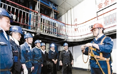 在“两学一做”教育活动中,安徽太子娱乐城 杨庄矿党员义务宣传安全生产知识。图为该矿共产党员、保运一区队长杨杰(右一)向工友传授保险绳使用技巧。郑洪光 摄