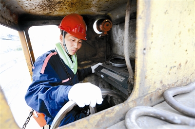 交接班的时候,上一班司机将车辆运行情况交待清楚,薛传斌看了一遍,还是不放心,发车前又对车辆检查一遍。