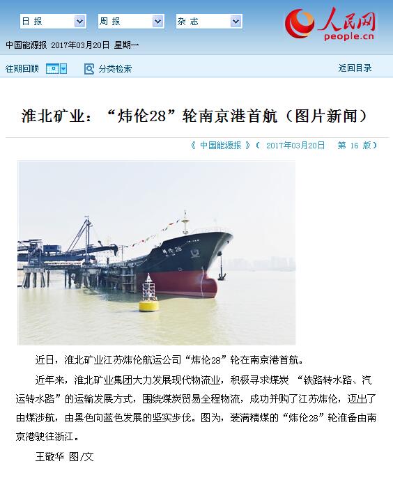 近日,淮北矿业江苏炜伦航运公司“炜伦28”轮在南京港首航。
