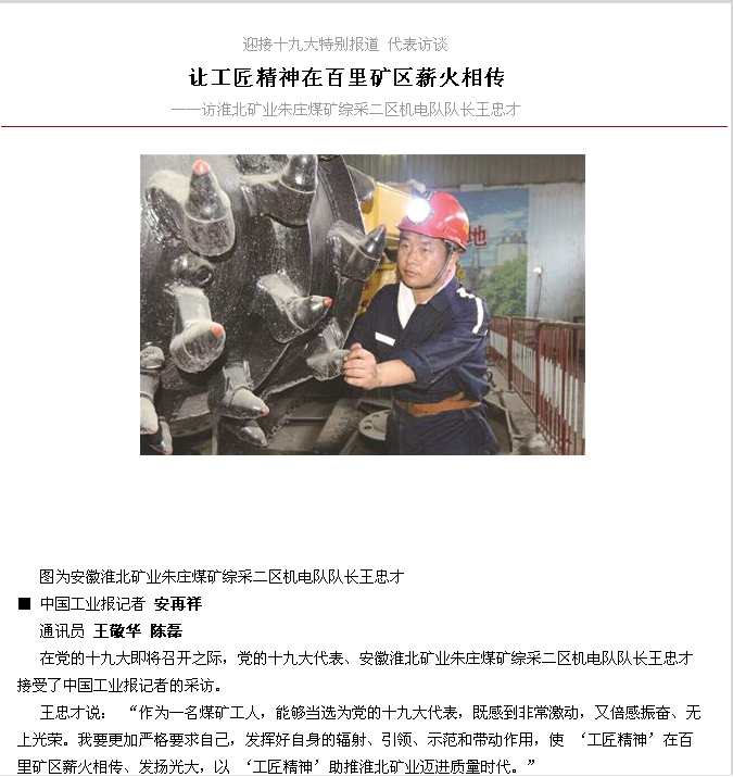 《中国工业报》1版头条:让工匠精神在百里矿区薪火相传
