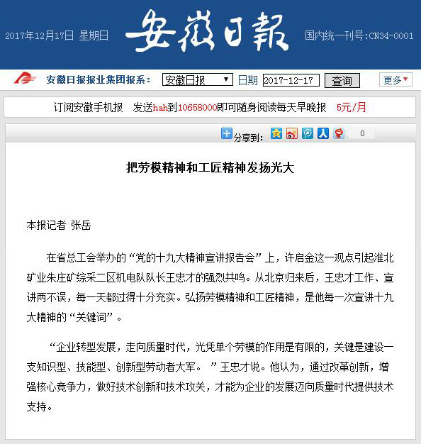 《安徽日报》2版:王忠才:把劳模精神和工匠精神发扬光大