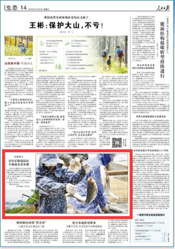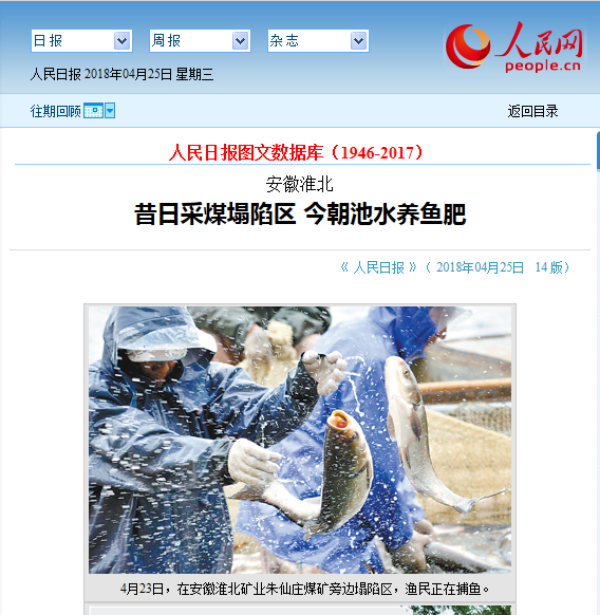 《人民日报》:朱仙庄矿采煤塌陷区清水养鱼肥