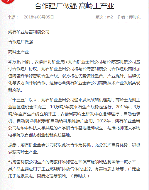 《中国煤炭报》:合作建厂做强 高岭土产业