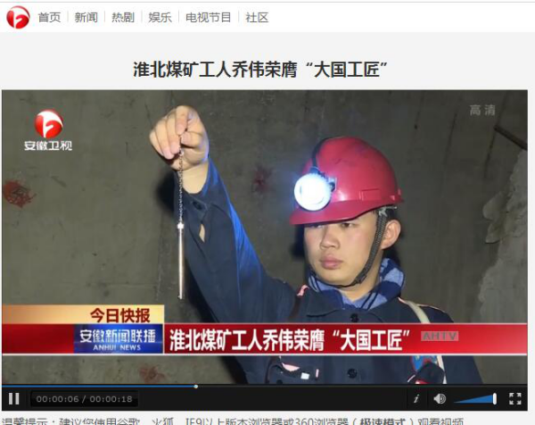 7月10日,安徽电视台《安徽新闻联播》节目播出淮北矿业袁店一矿瓦检工乔伟荣膺“大国工匠”消息。