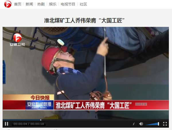 《安徽新闻联播》:袁店一矿工人乔伟荣膺“大国工匠”