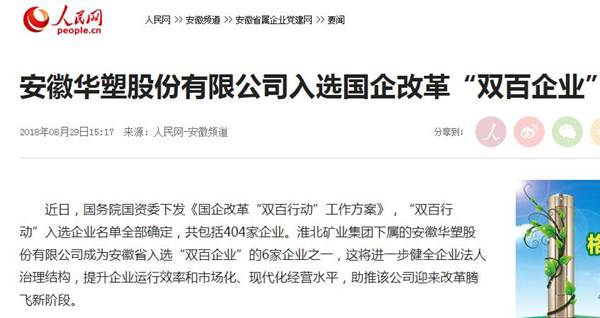 下属的安徽华塑股份有限公司成为安徽省入选“双百企业”的6家企业之一,这将进一步健全企业法人治理结构,提升企业运行效率和市场化、现代化经营水平,助推该公司迎来改革腾飞新阶段。