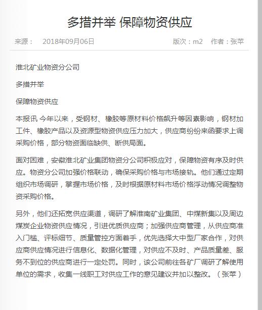 《中国煤炭报》:淮北矿业物资分公司多措并举保障物资供应