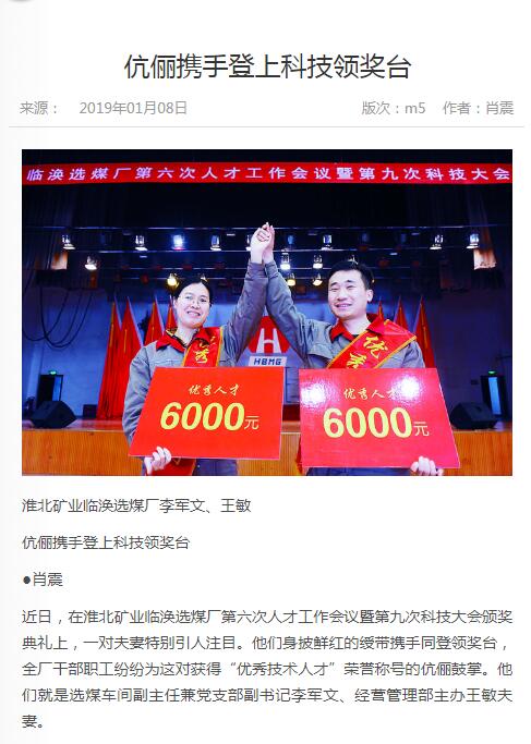 淮北矿业临涣选煤厂李军文、王敏伉俪携手登上科技领奖台