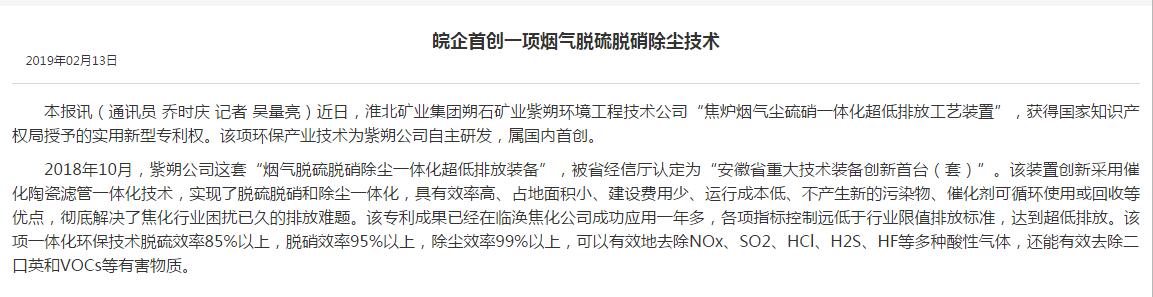 《安徽日报》:皖企首创一项烟气脱硫脱硝除尘技术