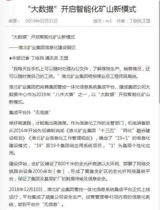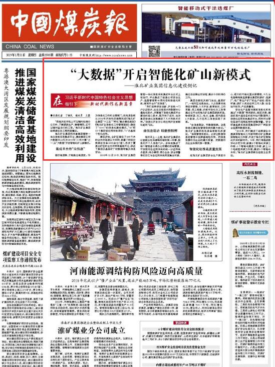 《中国煤炭报》1版头条:“大数据”开启智能化矿山新模式