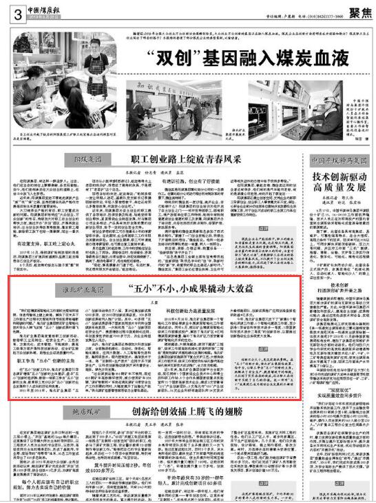 “五小”创新活动举办了八届,累计征集创新成果5000多项,近2000项创新成果获奖,300多项创新成果被列入推广计划。其中,40多项“五小”创新成果获得了国家实用技术专利和全国煤炭系统奖项,一大批优秀“五小”创新项目在安全生产、提质增效过程中就地转化应用,年创直接经济效益7000多万元,为企业转型发展注入活力。