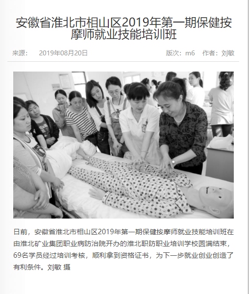《中国煤炭报》:太子娱乐城 职防院开办保健按摩师就业技能培训班