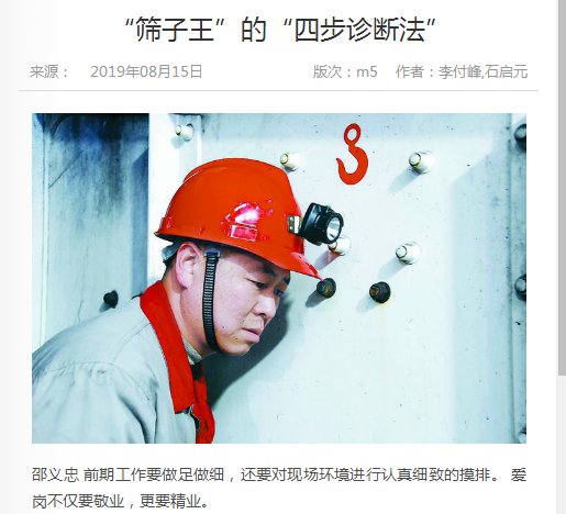 临涣选煤厂工作后,一直从事旋流器、直线振动筛的维护、维修工作,对直线振动筛、弧形筛等筛子的“脾性”了如指掌。他经过十几年的工作积累,总结出了一套“听(听筛子有无异常声音)、摸(摸激振器与过桥轴承组件温度)、踩(踩筛板与轨座是否松动、刷烂)、测(测激振器油位)”“四步筛子诊断法”,有效提高了筛子故障发现率,杜绝突发事故的发生,大大缩短了事故台时。这个方法在同行中得到广泛推广和应用。为此,大家给他起了个“筛子王”的绰号。