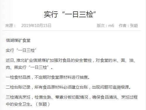 《中国煤炭报》:淮北矿业信湖矿食堂实行“一日三检”