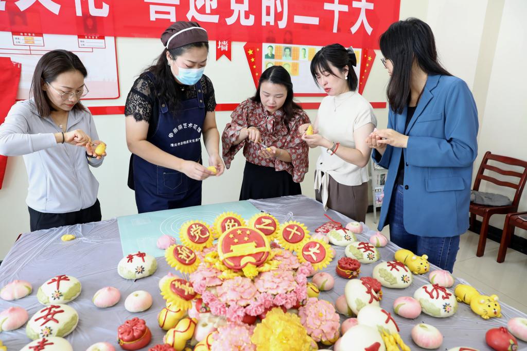 近日,在党的二十大即将召开之际,淮北市非物质文化遗产—民间花馍工艺传承人申丽丽来到神源煤化工基层班组,现场与职工一起互动,精心制作出含有党徽、龙、虎、牡丹、石榴、寿桃、苹果、麦穗、葫芦等造型图案的“喜迎党的二十大”主题花馍,寓意全国人民红心向党,中华民族龙腾虎跃,百姓生活花开富贵、事事如意、五谷丰登。