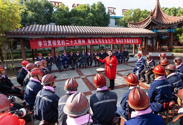 朱庄煤矿邀请淮北大鼓传承人李红艳来到矿山,利用大鼓这一当地群众喜闻乐见的形式为基层矿工宣讲党的二十大精神。