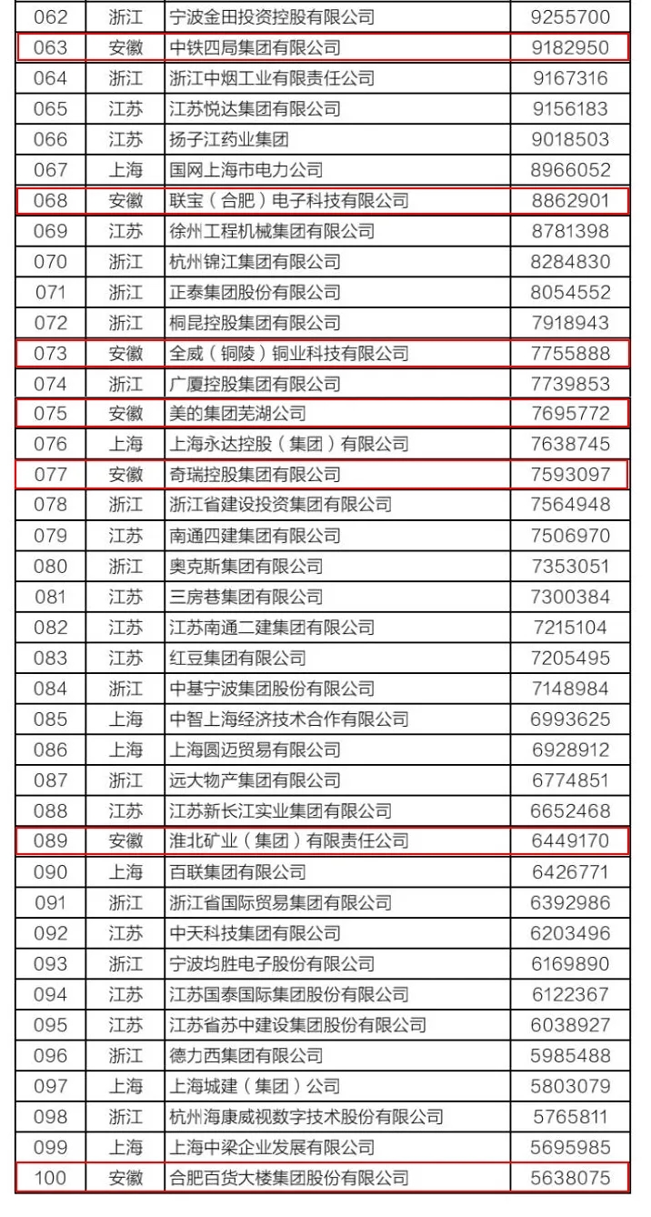 外,其他8家企业为海螺集团、铜陵有色、中铁四局、联宝(合肥)电子、全威(铜陵)铜业、美的集团芜湖公司、奇瑞控股集团和合肥百大,主要分布在水泥建材、有色金属、汽车制造、煤炭和煤化工等行业。